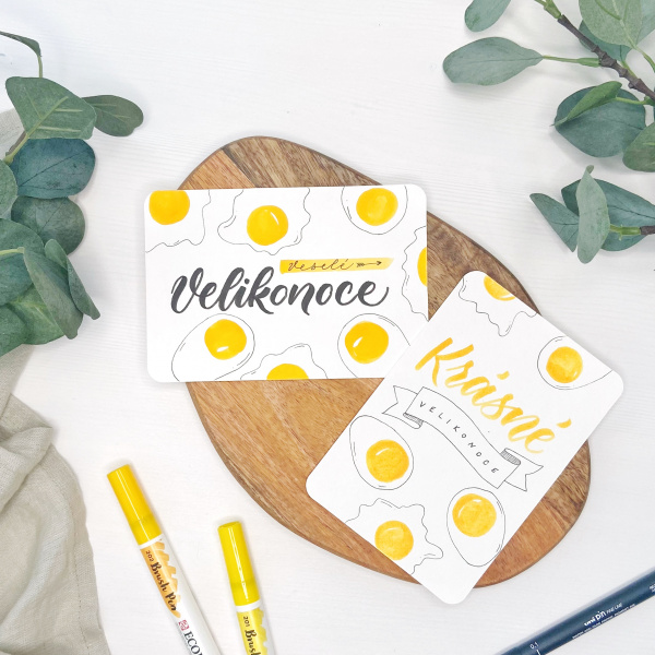 Na co se hodí žlutý fix? No přece na žloutek! Nevím jak vy, ale já mám Velikonoce spojené hlavně s vajíčky a tak když jsem přemýšlela na letošní podobou velikonočních pohledů, které budu jako každý rok rozesílat rodině, volba byla jasná. Já mám tyto jednoduché motivy v kombinaci s kaligrafií velmi ráda a to, že můžu konečně pořádně využít žluté odstíny brush penů, už je jen bonus.