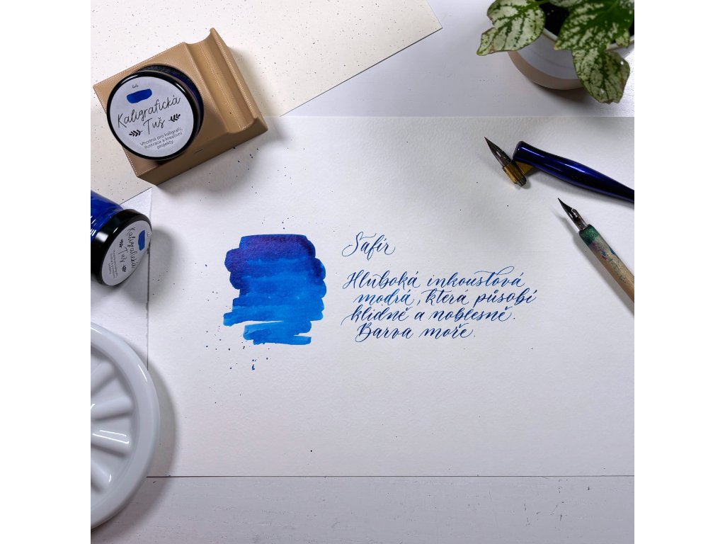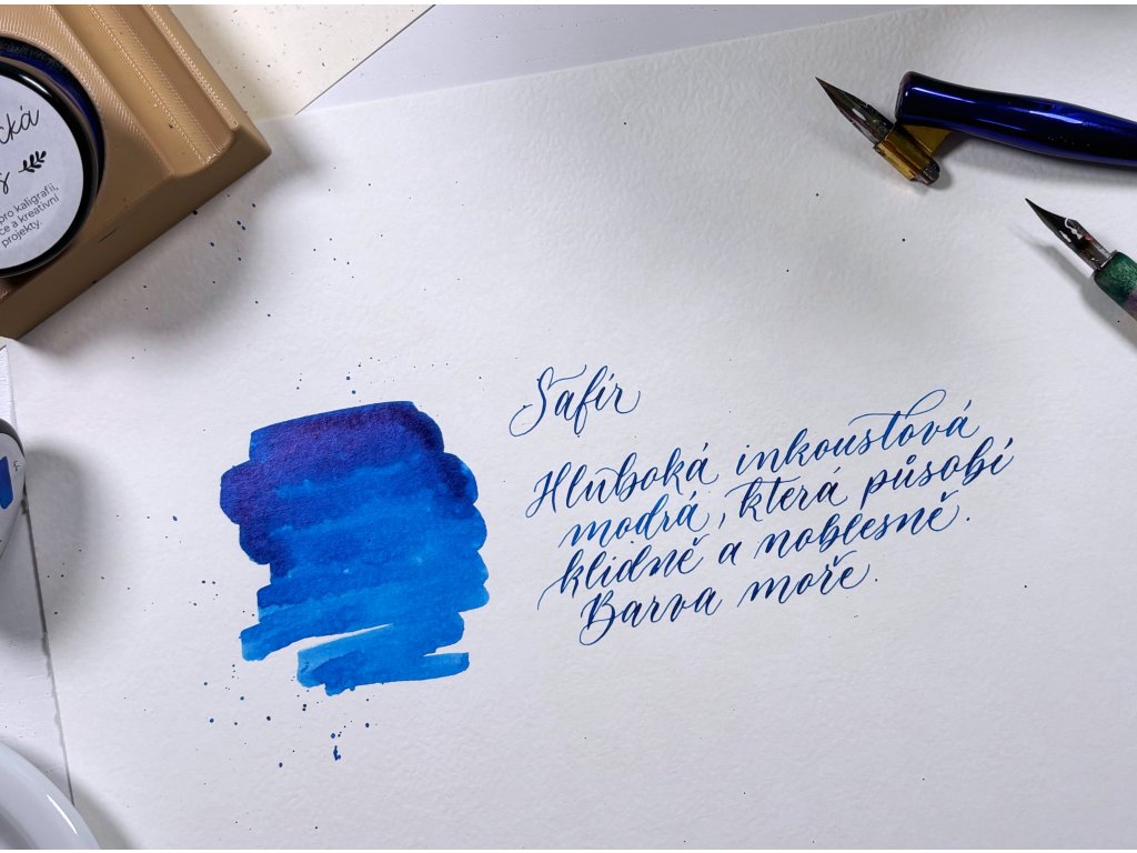 "Když vezmu tuš do ruky a ponořím hrot pera do lahvičky, je to pro mě malý rituál. Píše se s ní neuvěřitelně krásně a plynule – tahy jsou syté, stabilní a přitom působí lehce. Tuš je vhodná i pro úplného kaligrafického začátečníka.