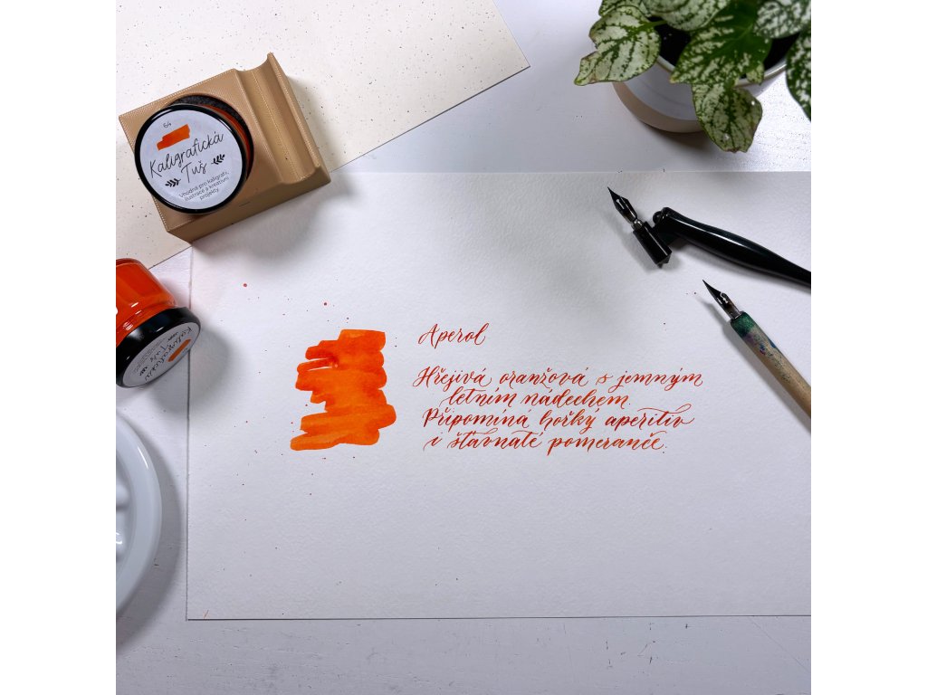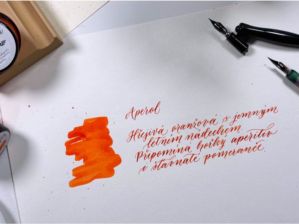 "Když vezmu tuš do ruky a ponořím hrot pera do lahvičky, je to pro mě malý rituál. Píše se s ní neuvěřitelně krásně a plynule – tahy jsou syté, stabilní a přitom působí lehce. Tuš je vhodná i pro úplného kaligrafického začátečníka.