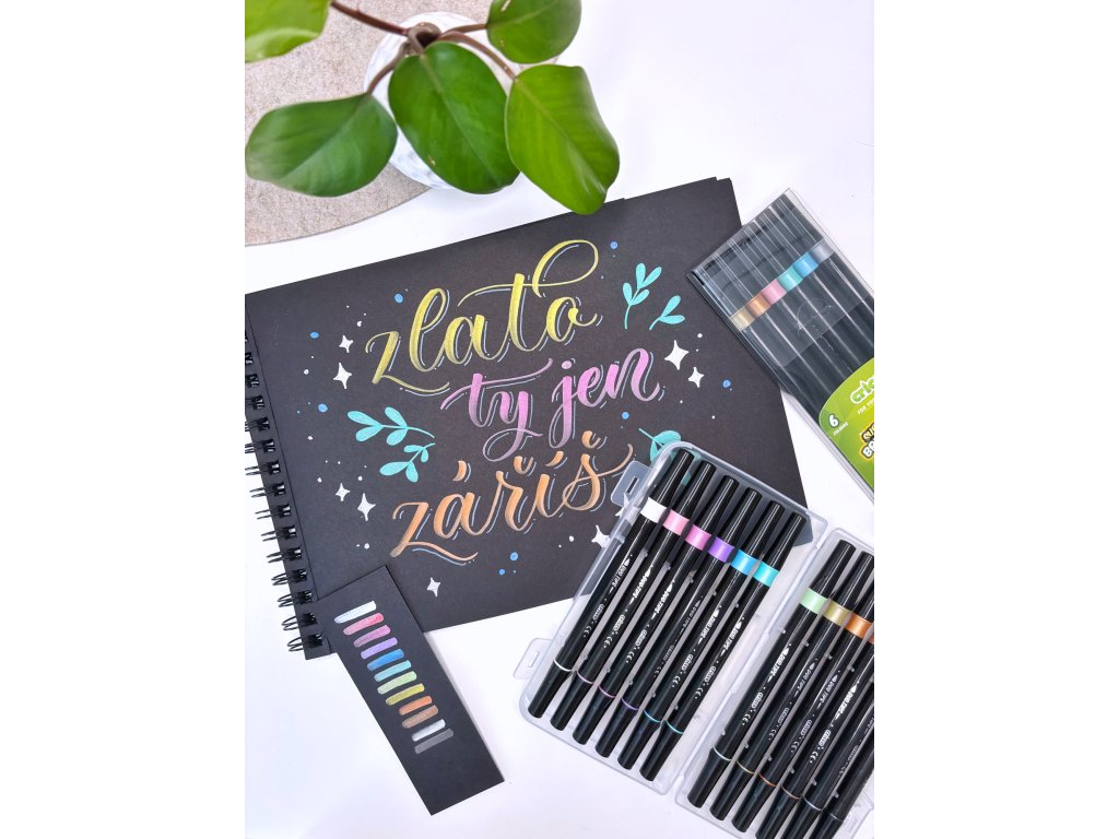 Dodejte svému tvoření lesk a eleganci! Tato sada 6 oboustranných fixů kombinuje štětcový hrot a klasický fixový hrot, takže zvládnete jemné detaily i výrazné tahy bez výměny nástroje. Výrazné metalické barvy krásně vyniknou na černém papíře.